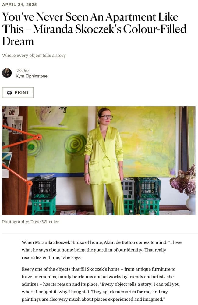 To what extent her surroundings impact her art practice was brought into strong relief during Melbourne’s protracted COVID-19 second wave. Skoczek continued to paint while juggling home-schooling as a single mother and, though challenging, it confirmed her home as an oasis – an extension of herself and identity, where her dreams are actualised and restored. This sense of happy containment has imbued her practice with deeper contemplations on time, space, change, transience, history and meaning, while simultaneously embracing contrasts as broad as those of the artist herself – materialistic yet spiritual, sometimes physical, sometimes soft and lyrical, intuitive and feminine, strong and self-assured.