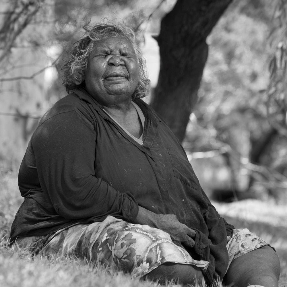 Sally M Nangala Mulda was born at Erldunda, then her family lived at Maryvale, now Tapatjatjaka (Titjikala Community), and currently resides in Mpwetyerre (Abbott’s Town Camp) by Lherre Mparntwe (Todd River).