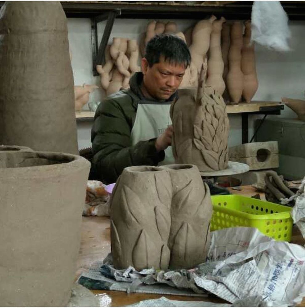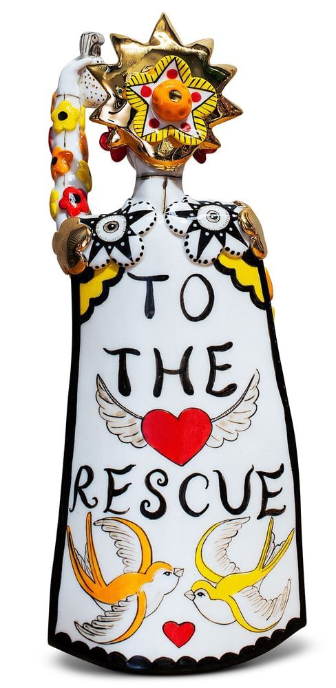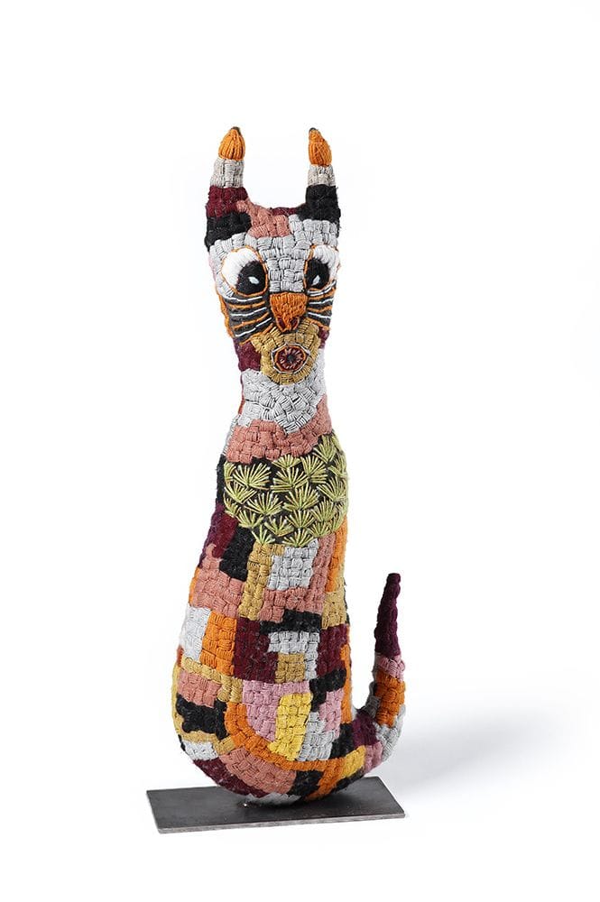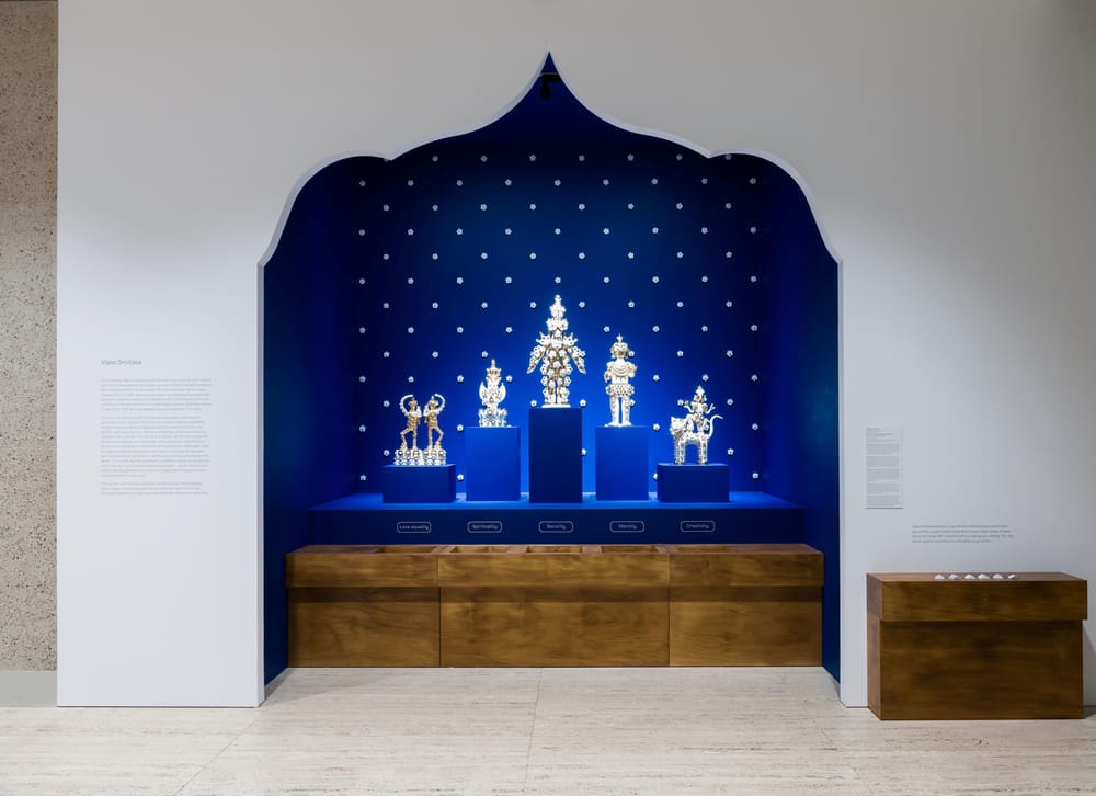 Standing between one and two feet tall, Srivilasa’s figures are clad in floral baubles, mandala-like motifs, and gold details, often with their fingers shaped like a V. The lively characters invoke both the mundane and the divine as they portray aspects of the spiritual world while firmly rooted on the earth."