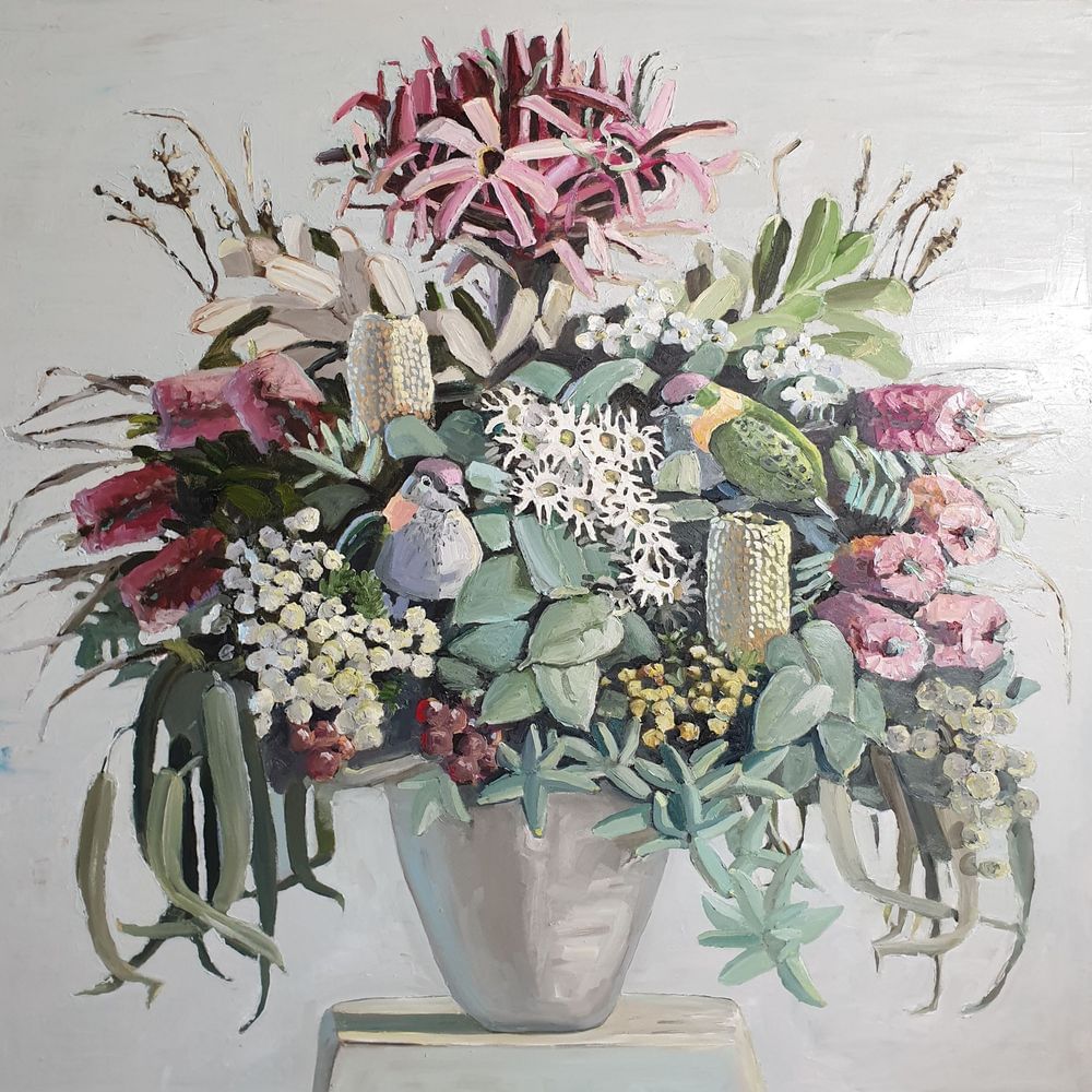 We are thrilled to announce that Sally Anderson’s work is a finalists in the Gosford Art Prize, with her work ‘November bells, BT mother, birth banksias, PP nude in a garden’.