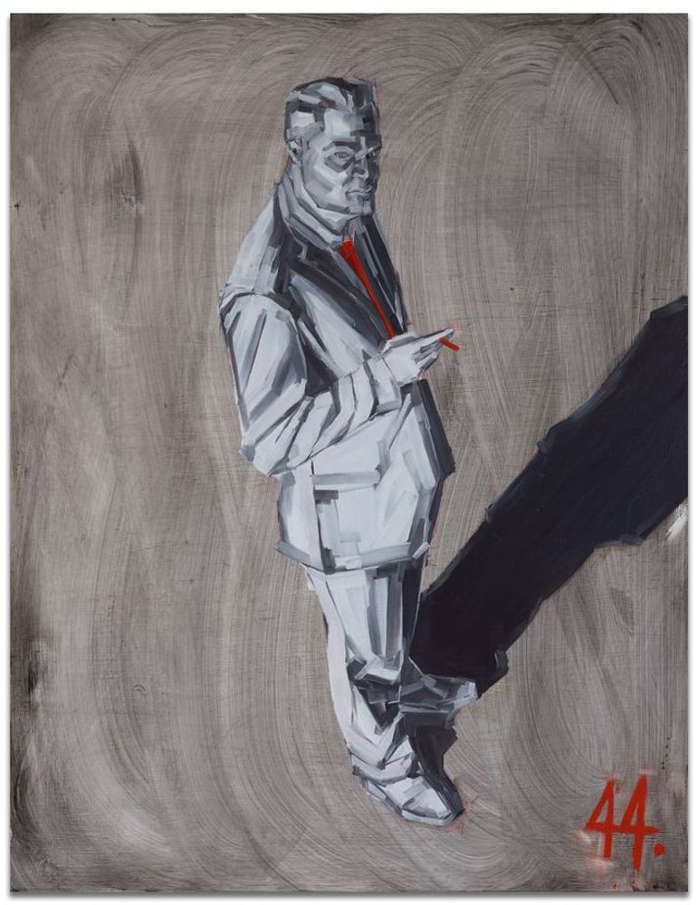 ‘I painted the portrait from the vantage point of his studio mezzanine. I turned all the lights off and spot lit him as if he were an actor on stage. The number 44 in the bottom right-hand corner is a tongue-in-cheek homage to the way he signs his work, not with his signature but his age when he painted it. I have appropriated his concept as a sign of respect.’